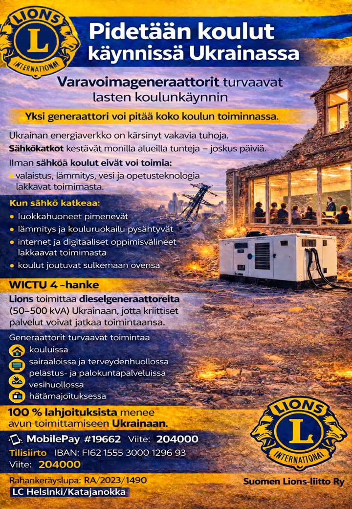 Lions Club Helsinki/Katajanokka on saanut LCIF:n (Lions Clubs International Foundation) Project Award -tunnustuksen "Winter is Coming to Ukraine 3" -hankkeeseen tekemästään merkittävästä lahjoituksesta.